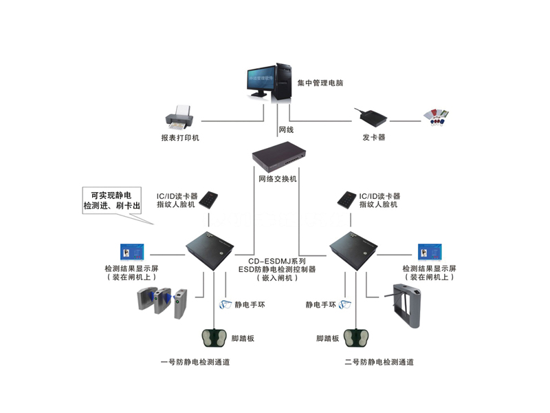 手腕帶和靜電鞋:刷卡后檢測(cè)手腕帶和靜電鞋,兩者檢測(cè)通過后閘機(jī)自動(dòng)打開,一般適用于員工